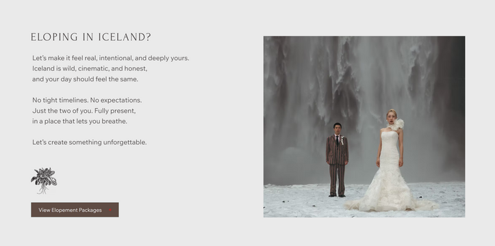 For Yaelopement, we crafted a visually engaging and emotionally driven website for a destination elopement and adventure wedding photographer based in Iceland. The site’s design emphasizes both the intimate nature of elopement experiences and the artistic storytelling of the photographer’s work, helping couples connect with the brand and envision their own meaningful moments.