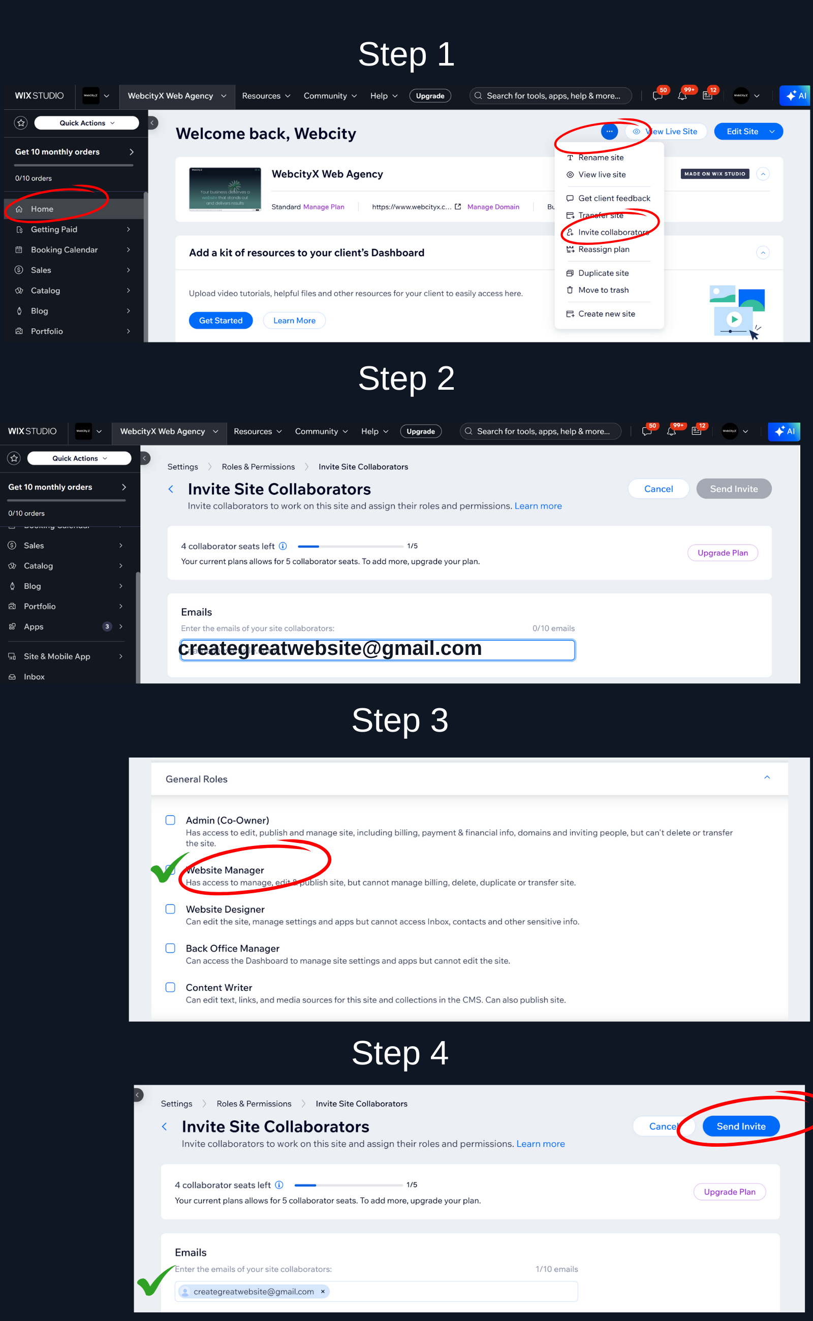 Add us as a collaborator through your Wix Dashboard with the role of Website Manager to the email: creategreatwebsite@gmail.com.